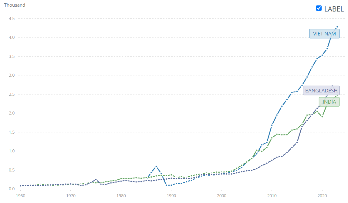 Beyond the neighbourly calumny, a comparison with economic competitors reveals a different image. India’s economic competitors (we listed this in a previous blog) have had ‘better numbers’. Despite 50 years of conflict that reduced the country to rubble, Vietnam overtook India in GDP per capita terms in 2005. According to the latest estimates, Vietnam’s household income was nearly 35% higher than those of Indian household income. Bangladesh, another one of India’s economic competitors, overtook India in terms of GDP per capita in 2018.